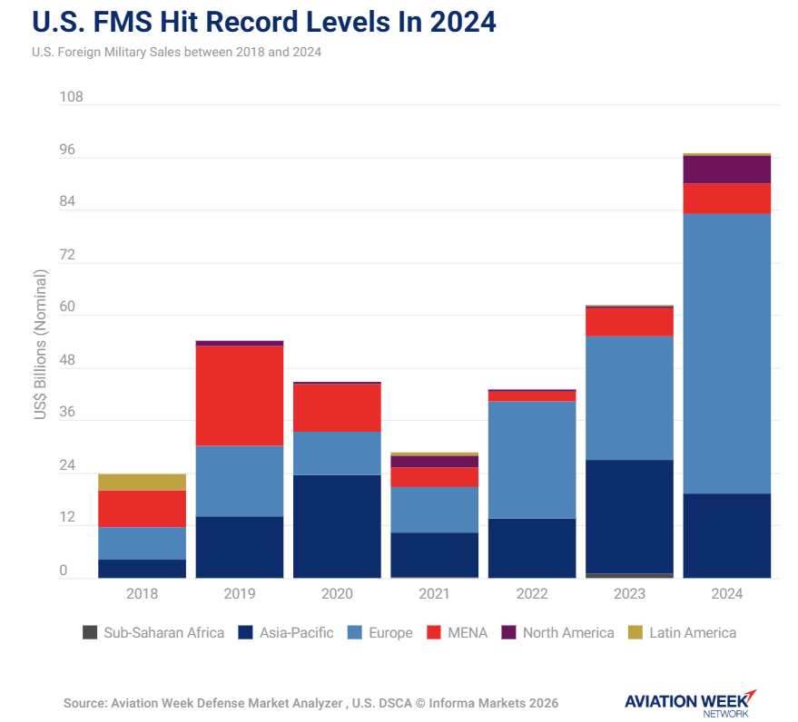 2024年、米国の対外有償軍事援助(FMS)は970億ドルという新記録に達し、2018年から2021年にかけての水準の2倍以上となりました。