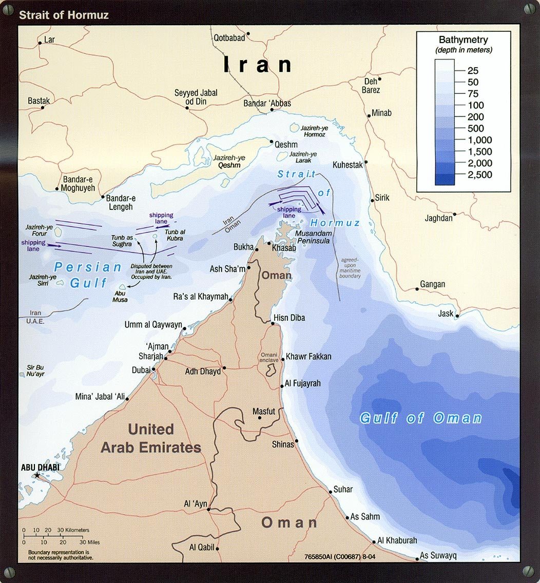 The Strait of Hormuz, showing political boundaries and shipping lanes. (Map: University of Texas Libraries, 2004).
