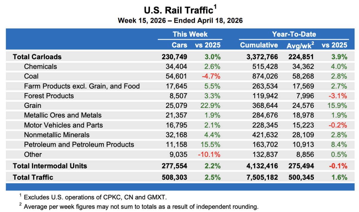 Freight on U.S. railroads totaled 508,303 carloads and intermodal units, up 2.5% for the week ending April 18, and pushing year-to-date traffic narrowly ahead of 2025 levels.