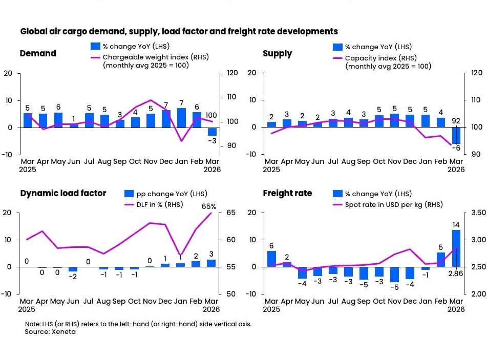 Global air cargo demand fell 3% year-on-year in March, while capacity supply was 6% lower than in March 2025.