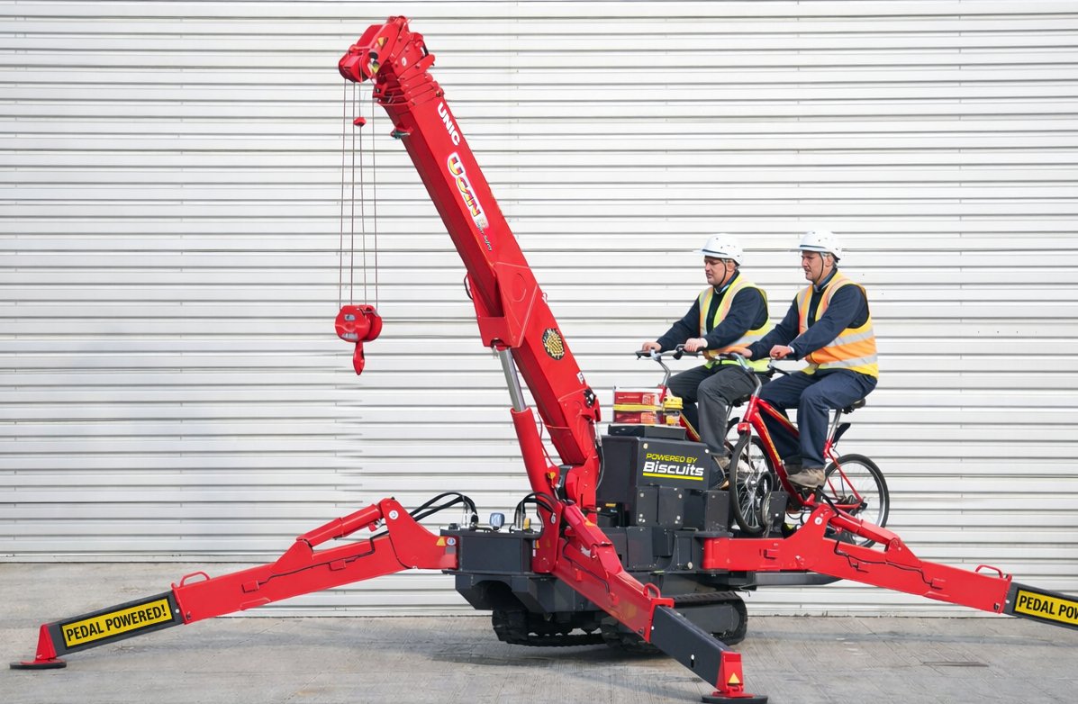 It has equipped one of its Unic URW 547 spider cranes with two bicycle frames with the wheels connected to high efficiency generators. With two people pedalling, the crane can operate at roughly 50 percent of the usual speeds, while retaining the same lifting power.
