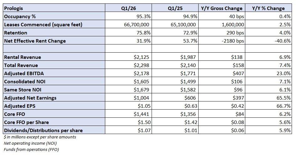 Prologis (NYSE: PLD) reported first-quarter consolidated revenue of $2.3 billion, which was 7% higher year over year and ahead of a $2.12 billion consensus estimate. Core funds from operations (FFO) of $1.50 per share were 8 cents higher y/y and 1 cent better than analysts’ expectations.
