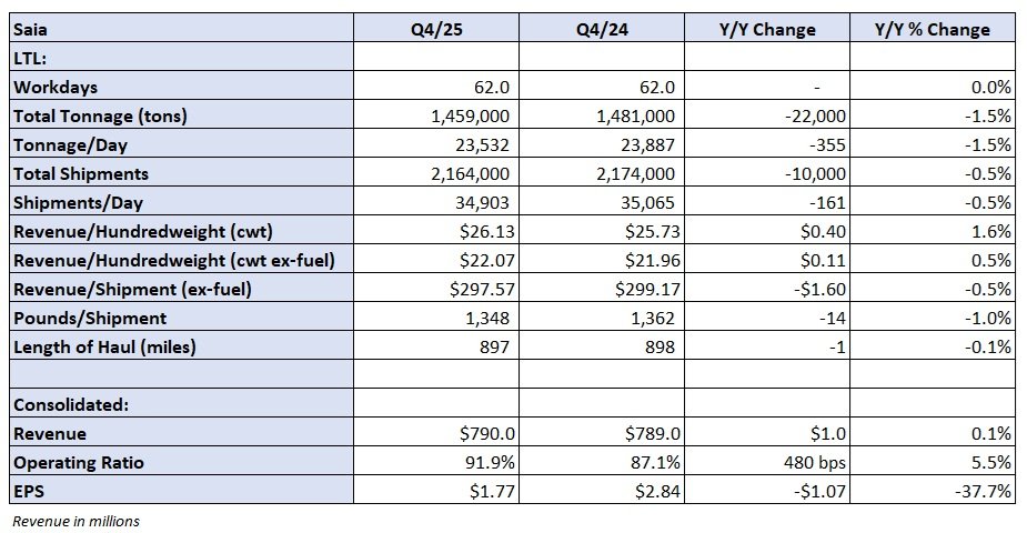 Saia reported fourth-quarter revenue of $790 million, which was $1 million higher y/y and $14 million better than the consensus estimate. On a per-day basis, revenue was flat as a 1.5% decline in tonnage was offset by a 1.6% increase in revenue per hundredweight, or yield. Yield was 0.5% higher, excluding fuel surcharges.