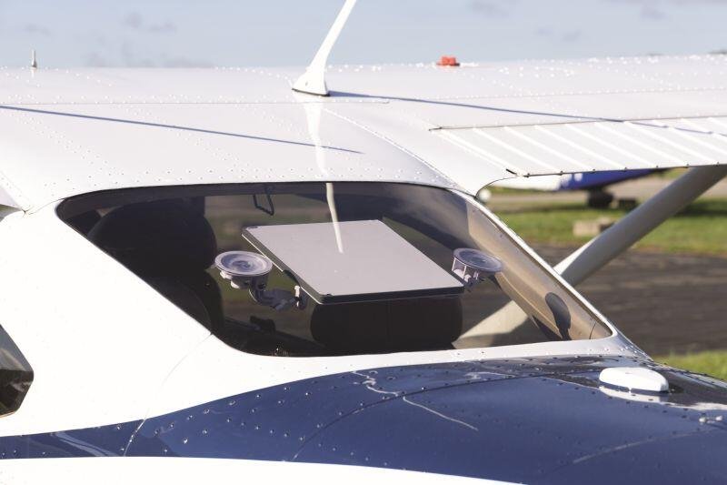 Starlink Mini Kit attaches to an aircraft windshield via a suction cup mount. Credit: Courtesy Sporty’s Pilot Shop