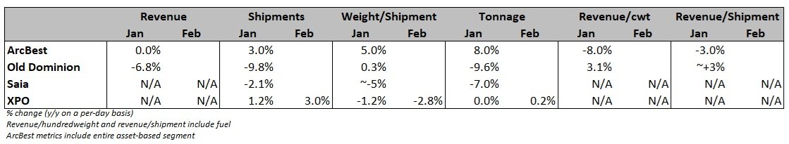 XPO (NYSE: XPO) reported a 0.2% year-over-year increase in tonnage during February as a 3% increase in daily shipments was largely offset by a 2.8% decline in weight per shipment. Final January numbers showed tonnage was flat y/y, with shipments up 1.2% and weight per shipment down 1.2%.